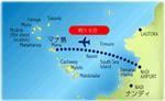 フィジーの空の表玄関、ナンディ空港に降り立った。貝のネックレスを首にかけてもらった。歓迎の挨拶だが、ちょっと 照れる。ナンディからマナ島まではセスナで約10分。マナはあいにく曇りだった。午後、突然の豪雨。この先思いやられる。夜は夜で激しい風と時折たたきつける雨。台風でも近づいているのだろうか。ブレの中でも、ヒュ−ヒューと風の音。日本から持ってきた南国リゾート向けCDを聞きながら眠りについたが、全然そんな雰囲気ではなく、ここはまるで冬の北国みたいだ。ここってほんとに南の楽園?こんなふうに思いながら、フィジーの旅が始まったのだった。